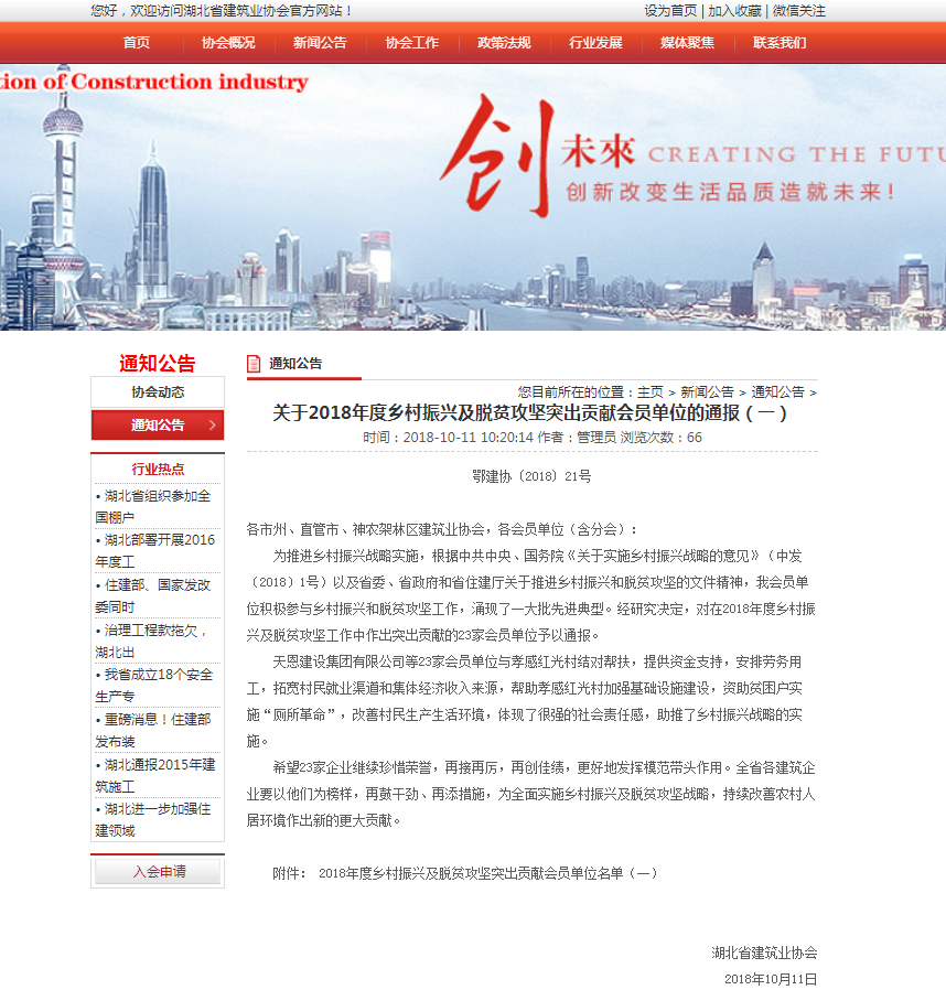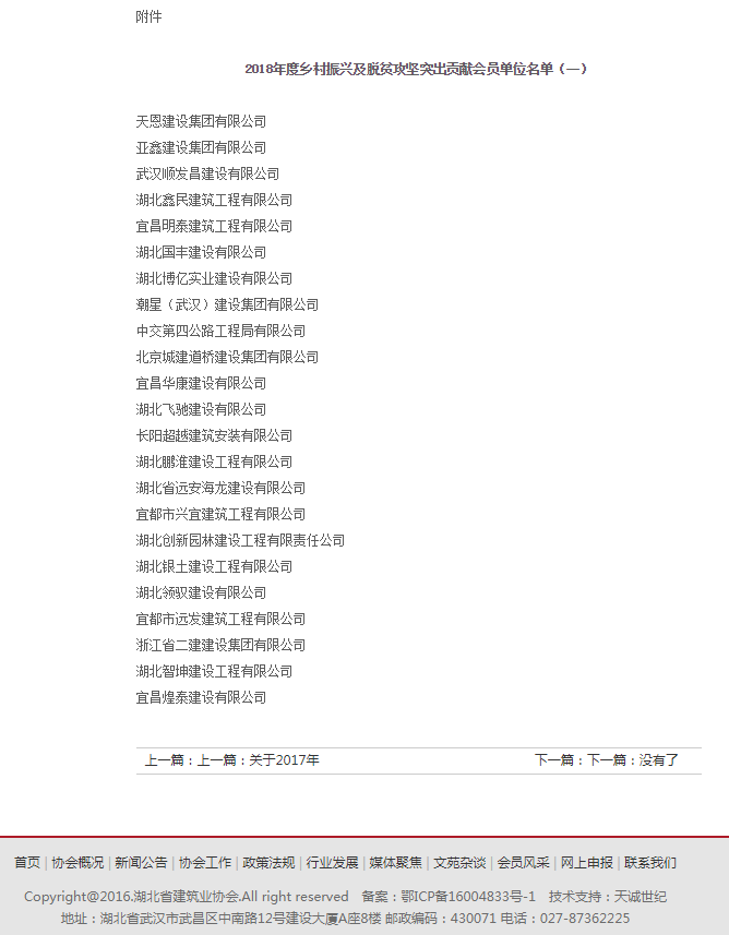 湖北省建筑業(yè)協(xié)會——關(guān)于2018年度鄉(xiāng)村振興及脫貧攻堅突出貢獻(xiàn)會員單位的通報