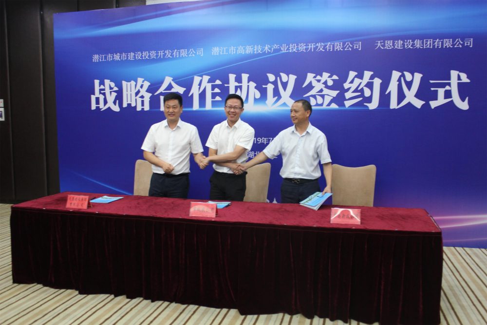 2019年7月3日上午,天恩建設集團有限公司與潛江市城市建設投資開發有限公司、潛江市高新技術產業投資開發有限公司三方共同合作,在七喜國際大酒店舉行裝配式建筑戰略合作框架協議簽約儀式。
